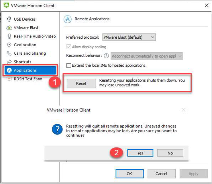 Under the Applications menu, Click Reset to close your current session. A warning message will appear, click yes to continue. *Please allow 10 seconds for the session to terminate before attempting to start an application again.
